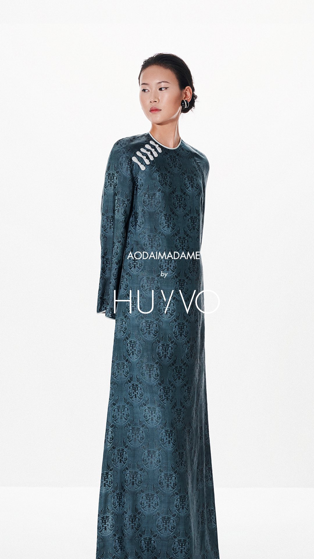 Hành trình ấy không chỉ dừng ở truyền thuyết, mà là một cuộc trở về với căn nguyên văn hóa: từ dấu ấn kiến trúc thời Lý, từ những vân khắc trên đá cổ, từ hình tượng mây được chạm khắc như biểu trưng của khí vận và cát tường. Những lớp vân ấy, qua bàn tay nghệ nhân và sự chắt lọc của thời gian, được chuyển hóa thành họa tiết trên nền lụa nơi quá khứ và hiện tại gặp nhau trong trật tự và tiết chế dưới sáng tạo từ HUY VO.